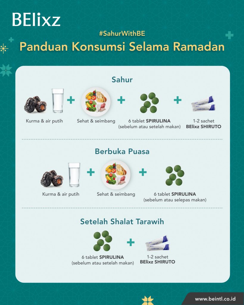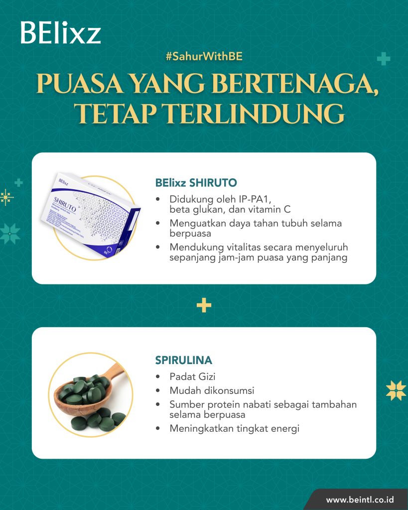 Untuk memastikan puasa anda “Tetap Berenergi dan Terlindungi”, fokuslah pada sahur anda. Ini adalah fondasi hari anda, dan dengan mengonsumsi suplemen yang tepat sasaran seperti BElixz SHIRUTO dan SPIRULINA, anda dapat menjaga vitalitas anda dari matahari terbit hingga matahari terbenam.